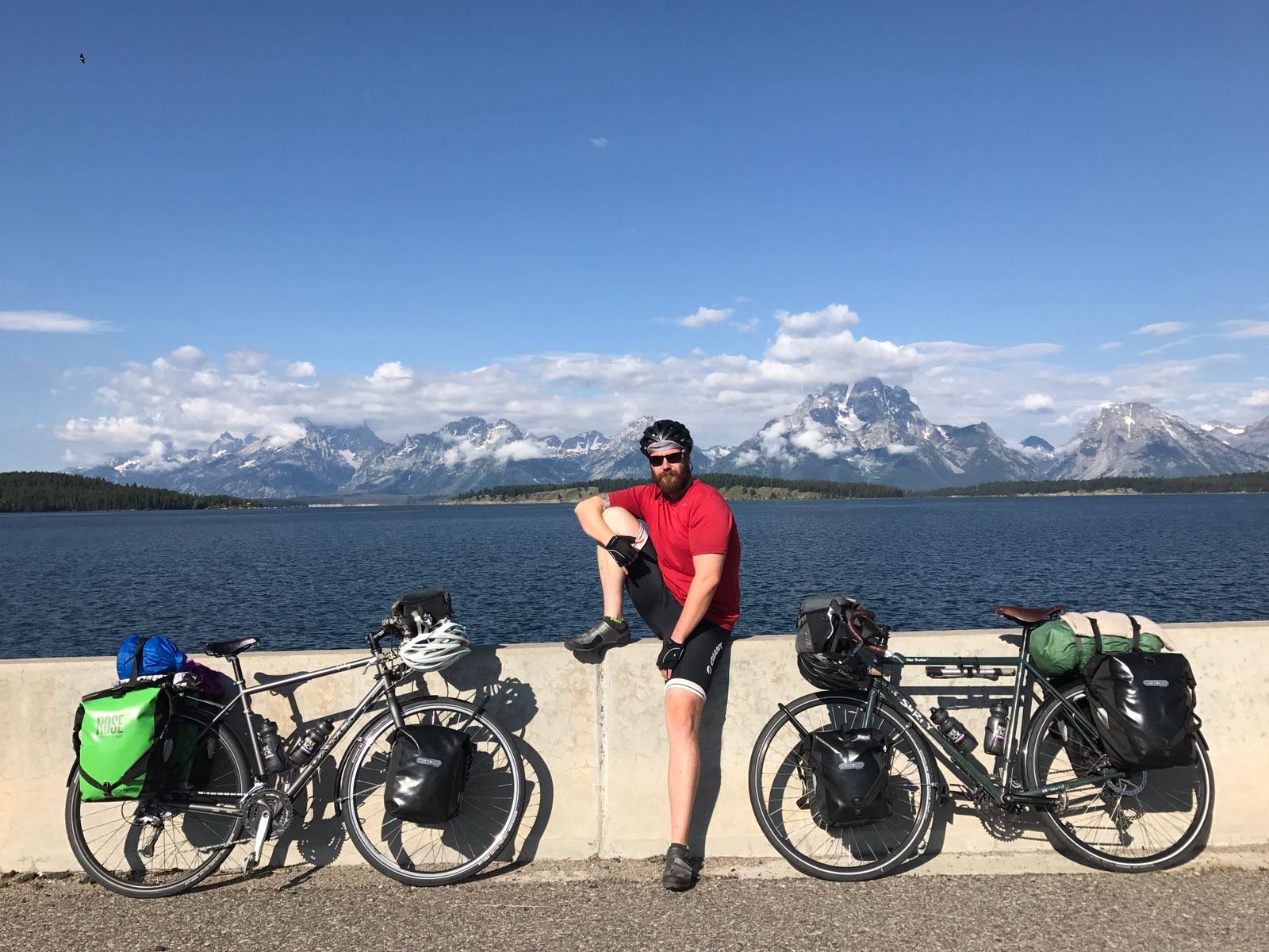 The climb is fairly long and steady. The dense forest and mountain views are gorgeous. One cannot see the Grand Tetons as we had hoped, we do however find our Aussie friends, Vic and Howard relaxing at the nearby lake. We pull off the road to get water, snack and rest. There was a cowboy fly fishing and a beautiful blue tick hound patrolling the parking lot and bikes.