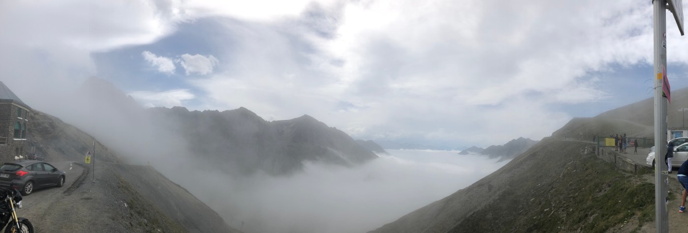 Without GPS or local knowledge of the area, we see where this route takes us. The climb is challenging, the air becomes more raw as we start to access the lower limit of fog and the hanging clouds in our search for the sun. At a certain point the mist becomes heavy, our clothes are more damp and visibility dissipates. We must turn around. Adair and I are not necessarily done riding for the day and so we decide to go back towards Gavarnie as long as we don’t hit clouds or significant rain.